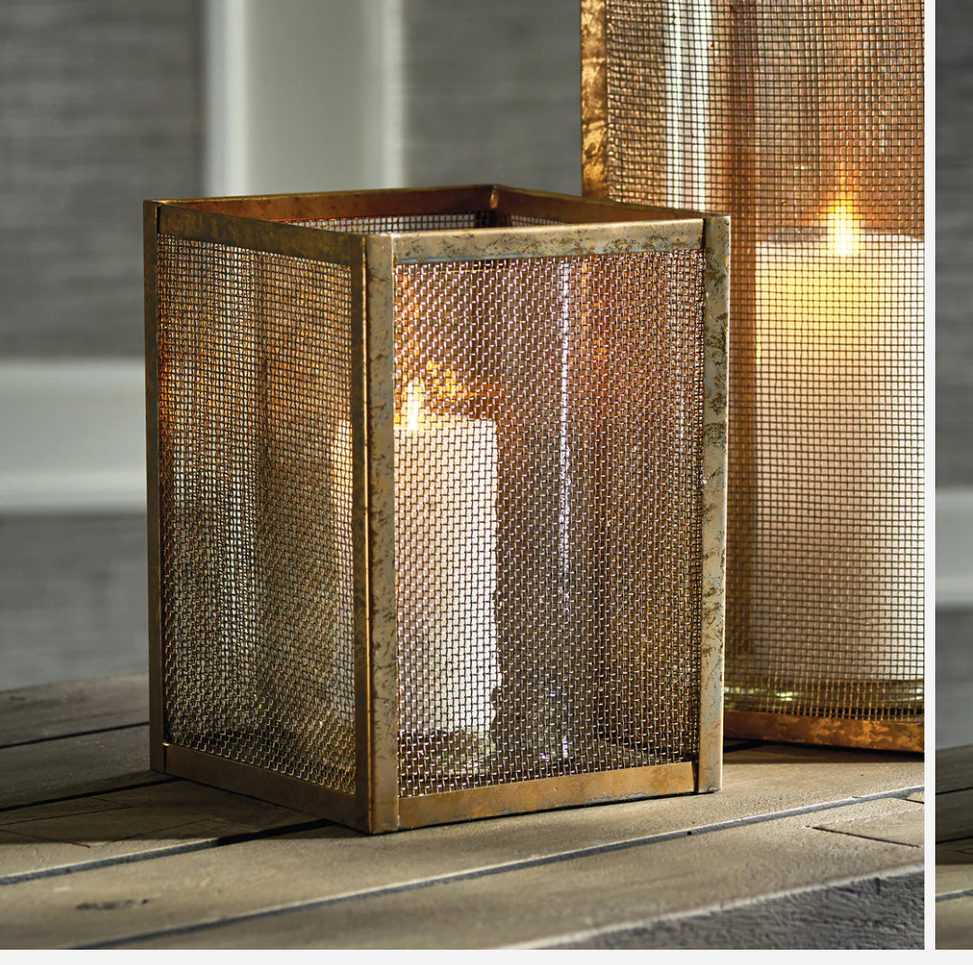 Diego is architectural in design. A light-catching mesh screen in antique gold adds a hint of drama. Complete with glass vases, not hurricanes so as to hold fresh florals as well as candles.